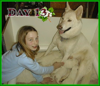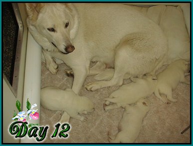 Day 11, the pups are standing up on front legs and attempting walking, pretty wobbly going though.