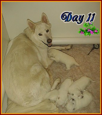 On day 10 the eyes of the 2nd born female started to open and the puppies found the comfort of moms pillow, TamarahK wants me to move the puppies off her pillow so she can nurse in comfort and she will look at me and whine till I move them.