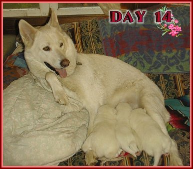 By day 9 the puppies are starting to try to stand up on their front legs, they are beginning to try to use their voices and exercise the howling voice. You can see that they are starting to kind of squint with closed eyes and that their eyes are getting ready to open.